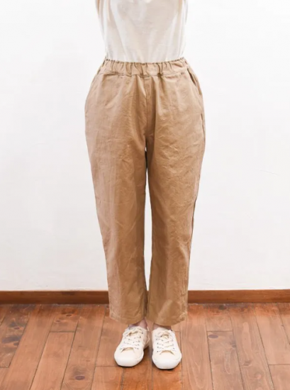股上が深く、裾に向かって細くなるテーパードパンツ。
