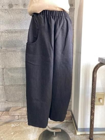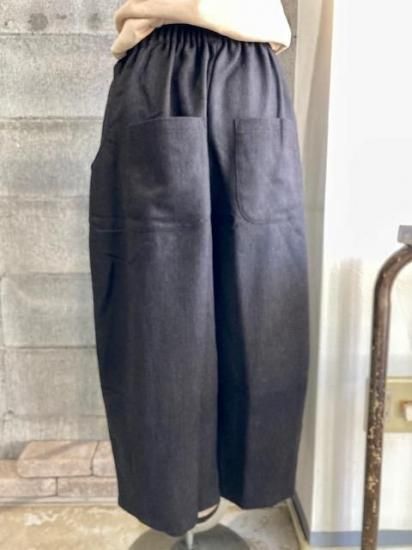 裾を少し絞った緩やかなバルーンシルエットの8分丈パンツで、ポケット口の丸いデザインがチャームポイント。