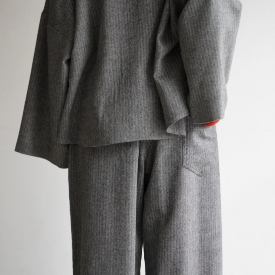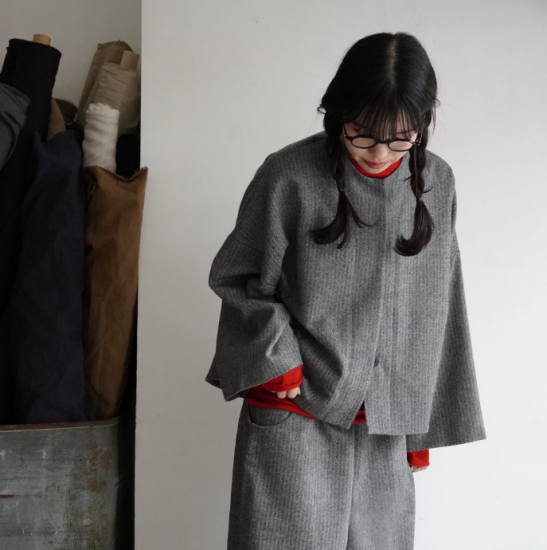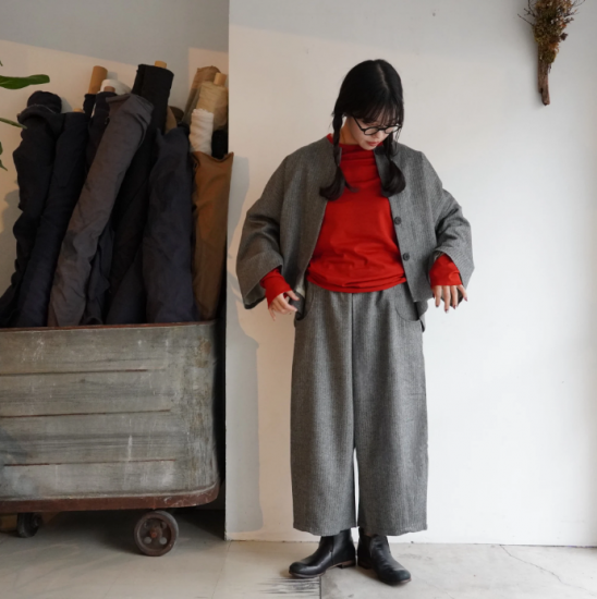 同素材のコッペパンツやポッカパンツとセットアップにして着ていただくと、きちんとした印象になります。
