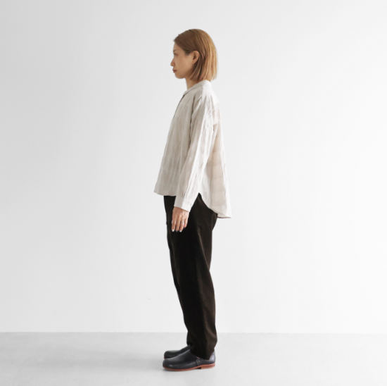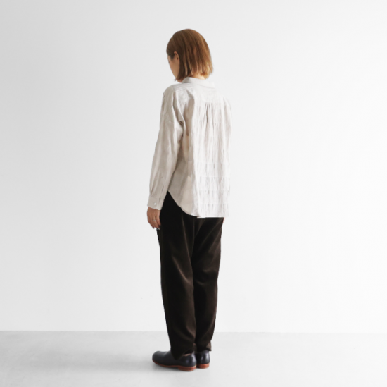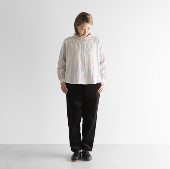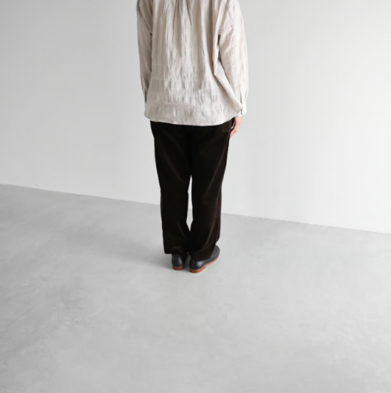素材はヨコ糸に綿麻の混紡糸を使用した、希少なコットンリネンのコーデュロイで、シャリ感のある独特な素材感を楽しんでいただける生地です。