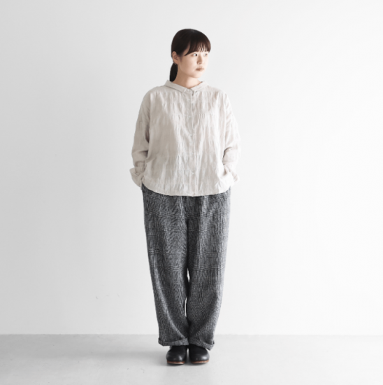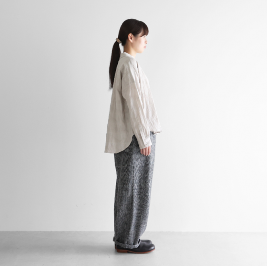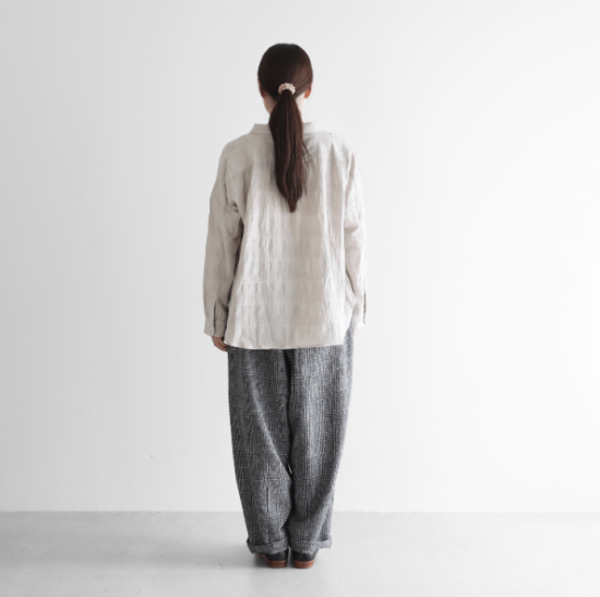 “日々の暮らしに馴染む、上質な日常着”をコンセプトに、世界的にも希少な旧式の「シャトル織機」で20〜30倍もの時間をかけて生み出す最高品質の「遠州織物」を使用したシンプルな衣服を展開しているHUIS.(ハウス)のバルーンパンツのロング丈。