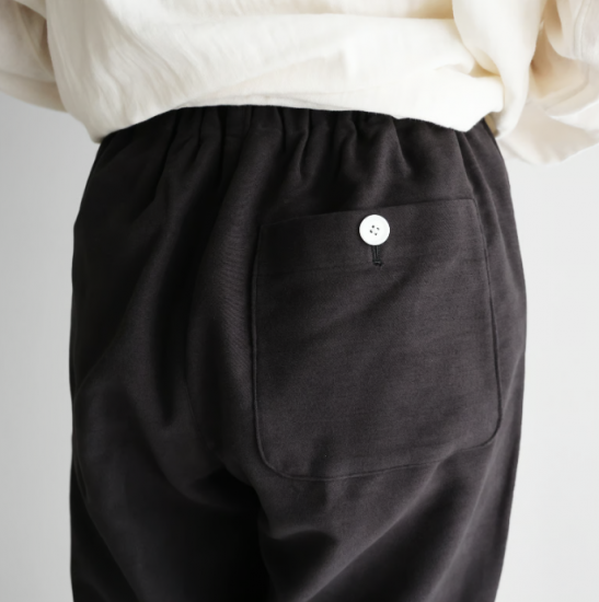 ヒップポケットについた大きめのボタンが後姿のアクセント。