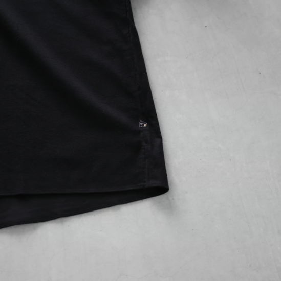 両脇裾には小さなスリット、左裾にはHUIS.のロゴ刺繍入り。