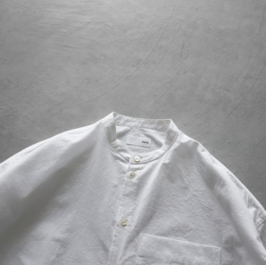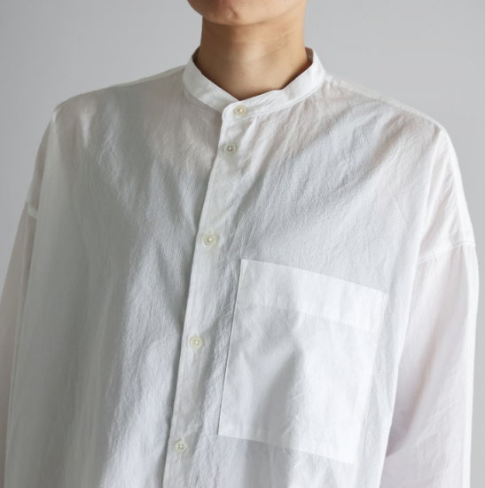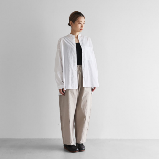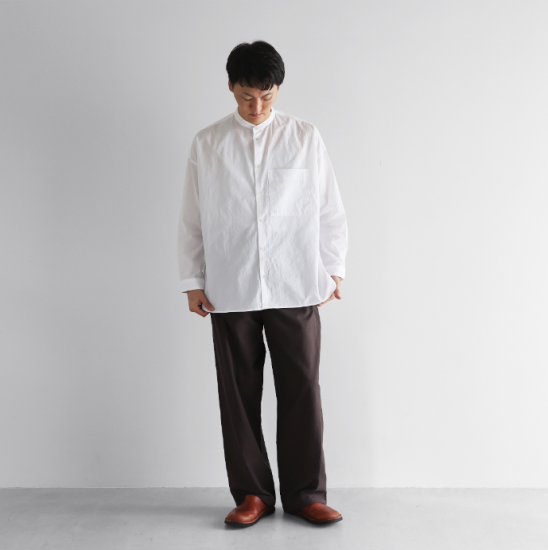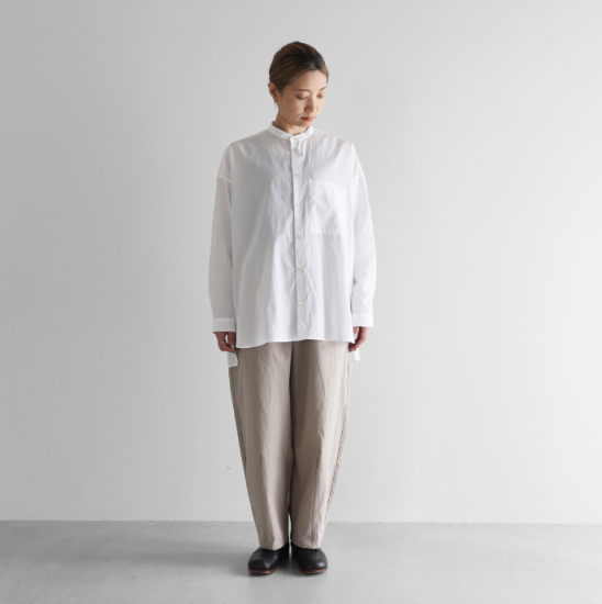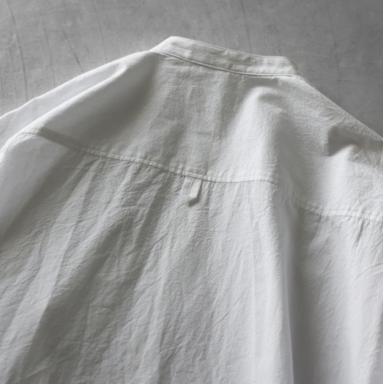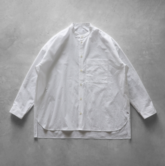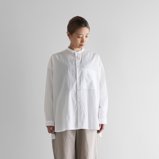 身幅をたっぷりととったオーバーサイズのシャツで、バンドカラーのすっきりとしたデザインです。