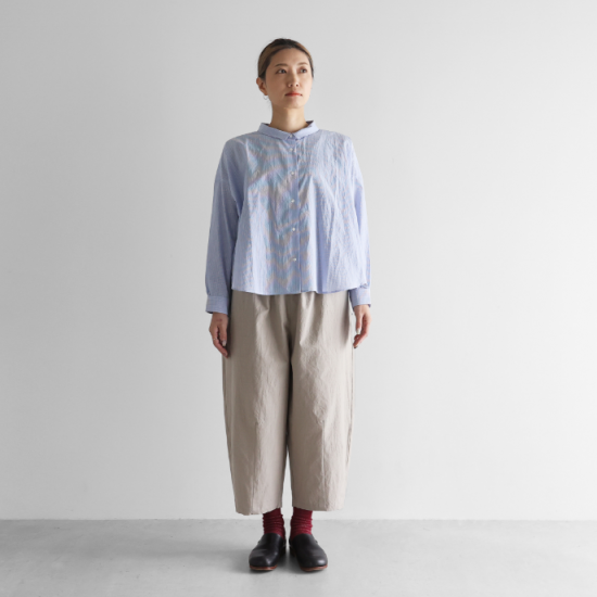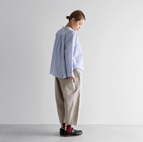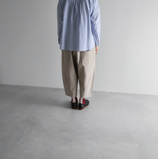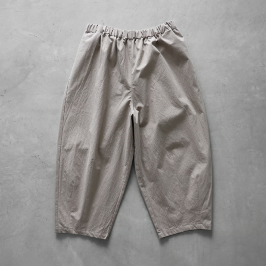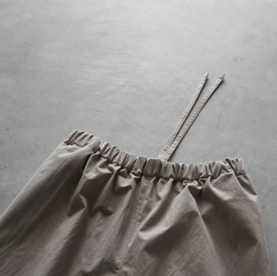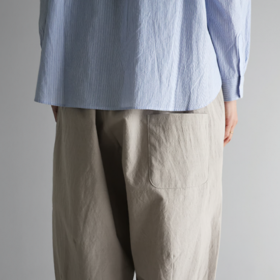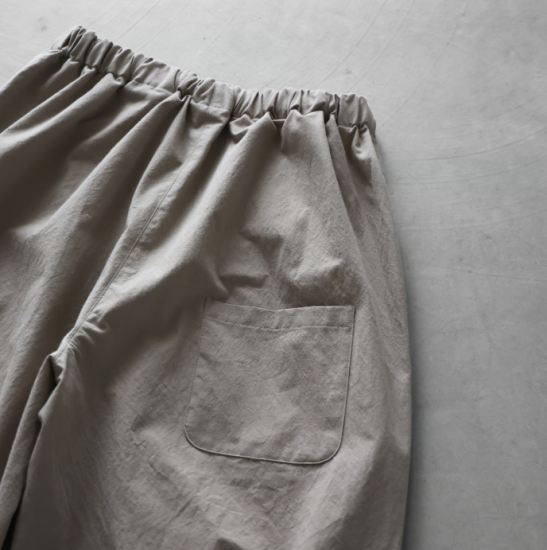 “日々の暮らしに馴染む、上質な日常着”をコンセプトに、世界的にも希少な旧式の「シャトル織機」で20〜30倍もの時間をかけて生み出す最高品質の「遠州織物」を使用したシンプルな衣服を展開しているHUIS.(ハウス)のバルーンパンツ。